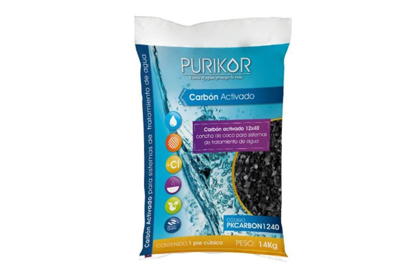 "Carbón activado" de concha de coco, ampliamente utilizado en procesos de tratamiento de agua, teniendo como funciones principales las de eliminar el cloro libre que por norma se adiciona al agua potable y absorber los contaminantes orgánicos que por su naturaleza están en el agua y que se encuentran en bajas concentraciones.